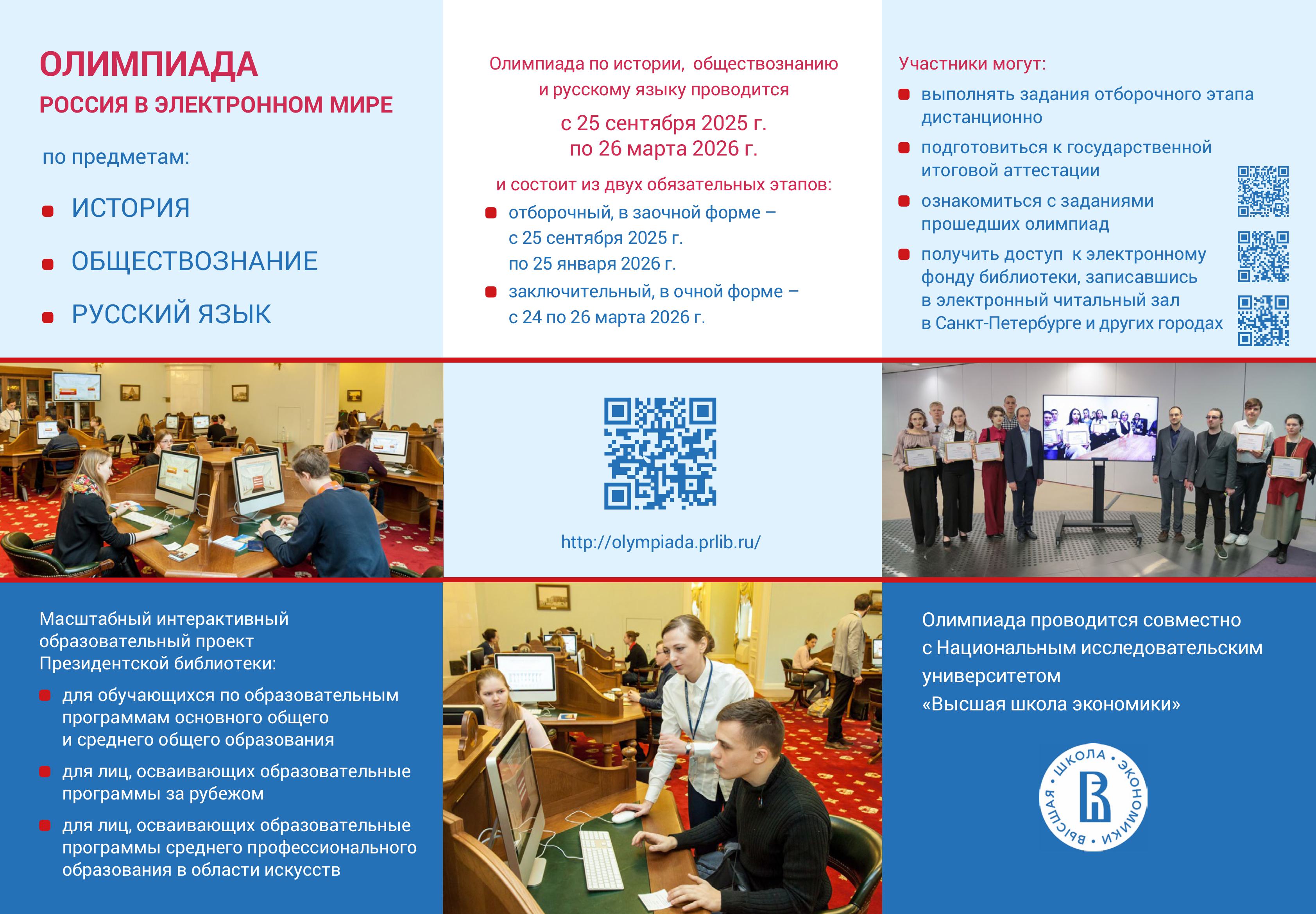 Президентская библиотека совместно с НИУ «Высшая школа экономики» проводит олимпиаду школьников «Россия в электронном мире»