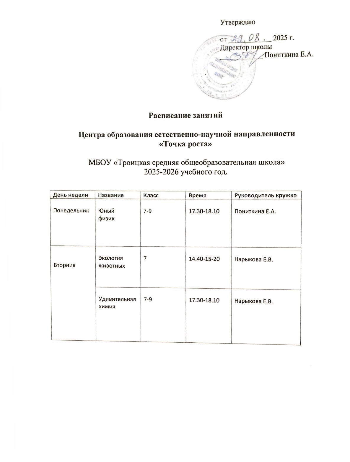 Расписание работы Центра образования естественно-научной направленности "Точка роста" на 2025-2026 учебный год